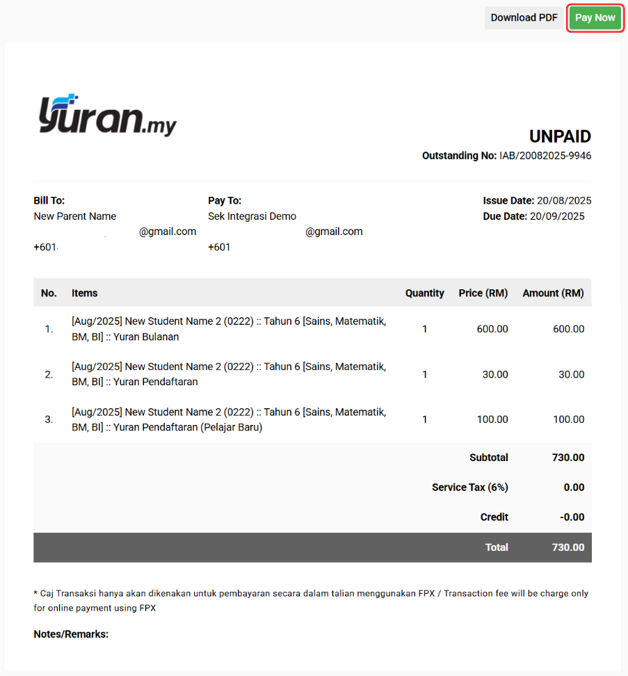 Invois anda akan dipaparkan seperti berikut. Tekan butang "Pay Now"
