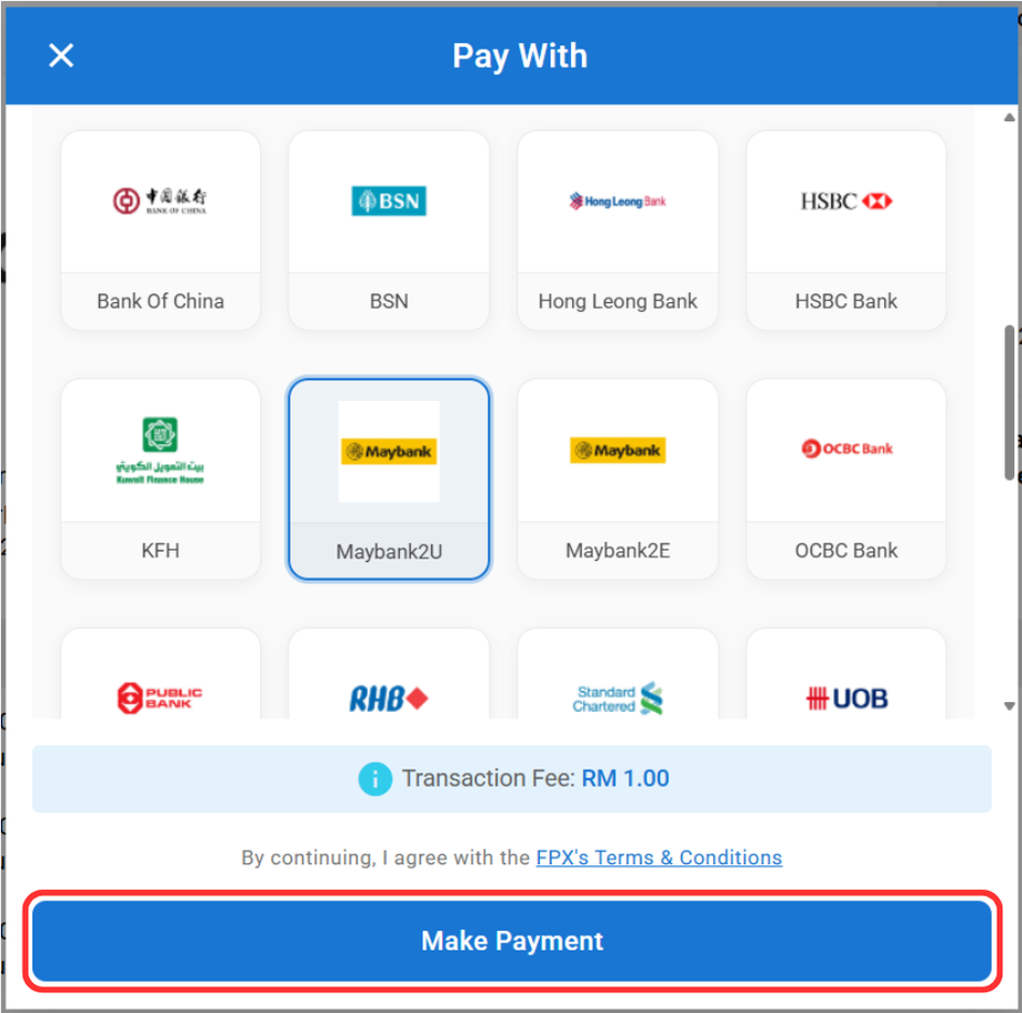 Pilih bank anda dan tekan "Make Payment". Anda akan ke payment gateway bank anda untuk buat pembayaran.