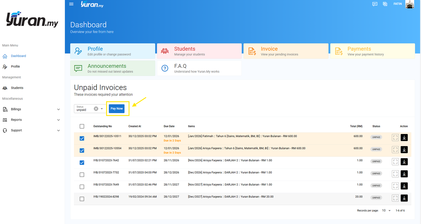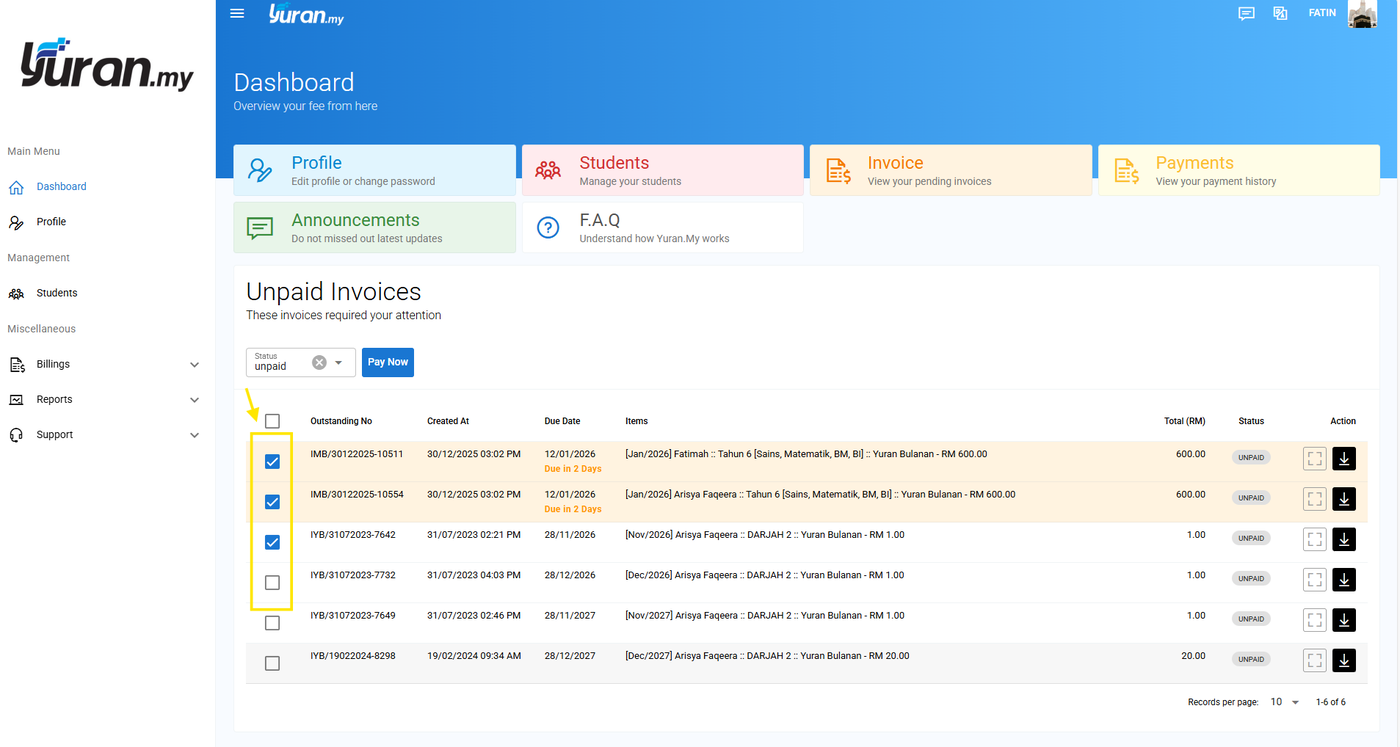 Langkah 2: Pada bahagian Invois Belum Dibayar di dashboard, pilih atau tick pada invois yang ingin dibayar.
