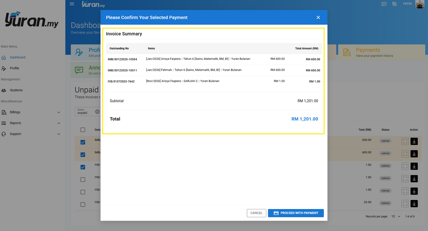 Langkah 4: Sistem akan memaparkan senarai ringkas rekod invois yang dipilih serta jumlah yang perlu dibayar