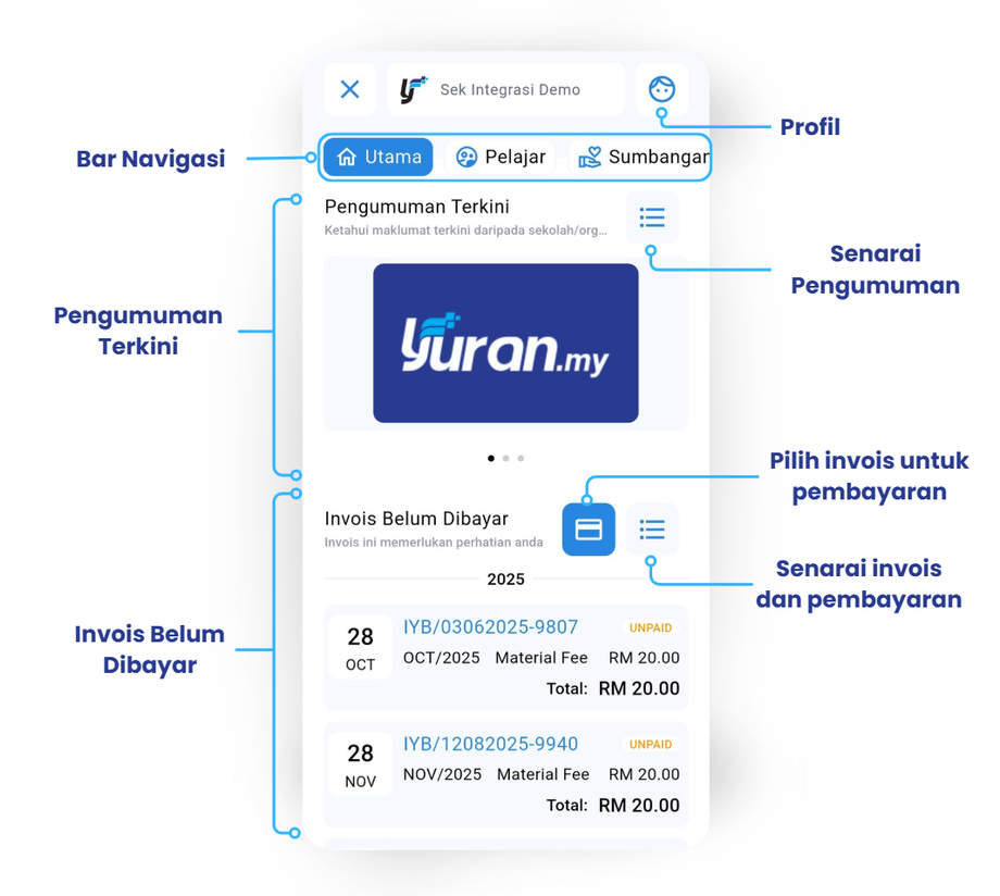 3.0 Laman Utama Laman Utama mengandungi Pengumuman Terkini yang dihantar oleh Sekolah/Organisasi dan juga Invois Belum Dibayar Pengguna boleh melihat Pengumuman Terkini dan juga Invois yang Belum Dibayar