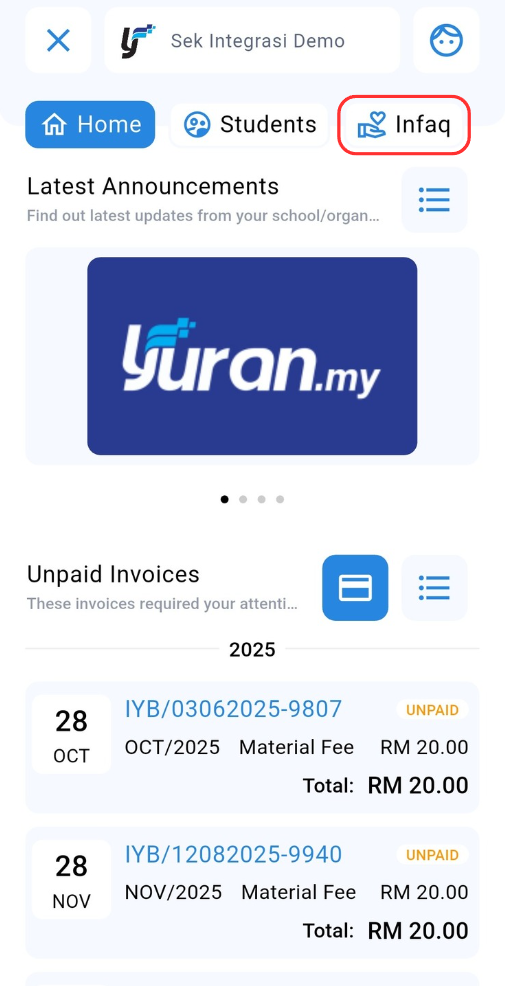 Pengguna boleh membuat infaq atau sedekah kepada sekolah/organasasi menerusi aplikasi Yuran.my